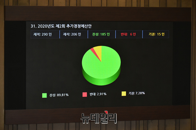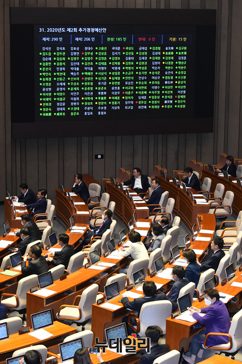 긴급재난지원금 관련 2020년도제2회 추가경정예산안이 30일 오전 국회에서 열린 제337회 국회 제3차 본회의에서 통과 되고 있다.