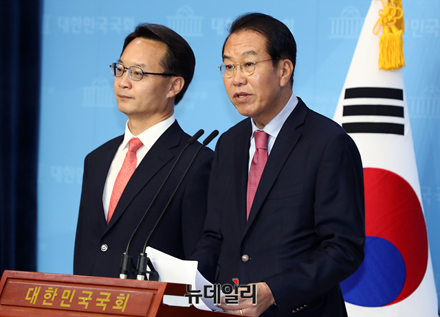 권영세 미래통합당 당선자(왼쪽)가 6일 오전 국회 소통관 기자회견장에서 원내대표 경선 출마 선언을 하고 있다.
