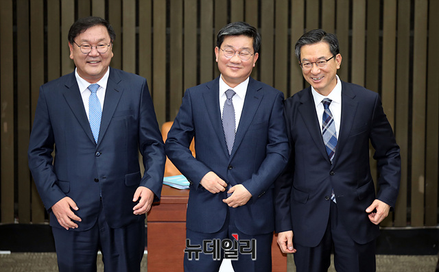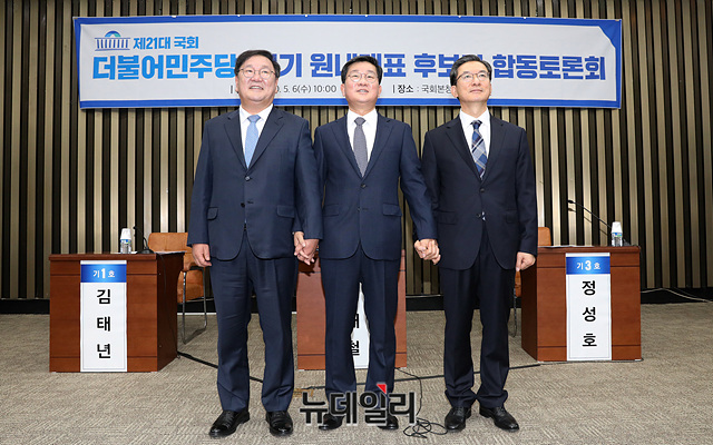 더불어민주당 원내대표 경선에 출마한 김태년(왼쪽부터 기호순), 전해철, 정성호 의원이 6일 오전 국회에서 열린 민주당 원내대표 후보자 합동토론회에서 기념촬영을 하고 있다. 더불어민주당은 7일 21대 국회 첫 원내대표를 선출하기 위한 경선을 갖는다.