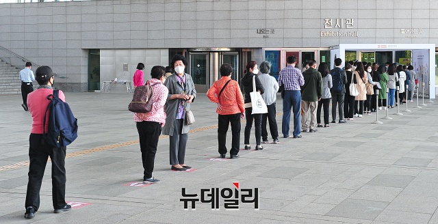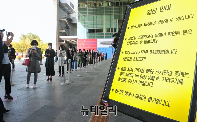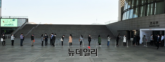 '코로나19(중국 우한 폐렴)' 방역 체제가 '생활 속 거리두기'로 전환된 6일 오전 서울 용산구 국립중앙박물관에서 관람객들이 거리를 두며 입장하고 있다.문화체육관광부는 6일부터 국립중앙박물관, 국립중앙도서관 등 소속 24개 박물관·미술관·도서관 서비스를 부분적으로 재개한다고 밝혔다.이날 재개관한 국립중앙박물관은 사전에 홈페이지에서 예약을 해야 입장 할 수 있다. 관람객 밀집을 피하기 위해 시간당 300명으로 입장 인원을 제한하고, 개인 관람만 가능하다.