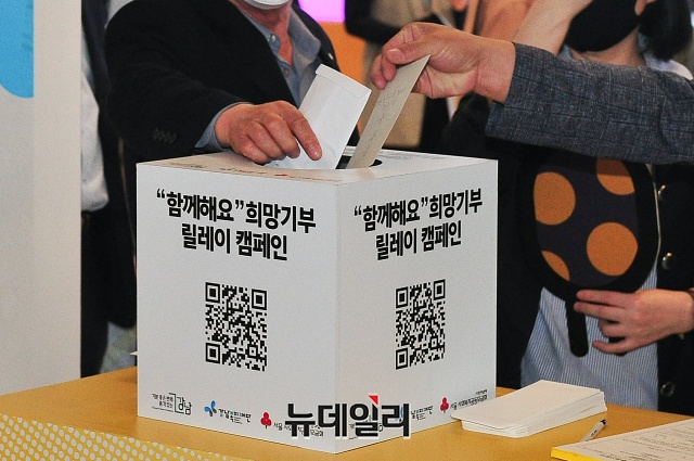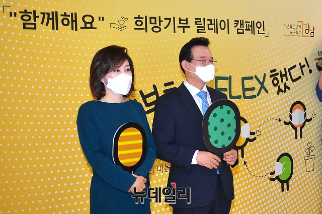 정순균 강남구청장 내외, NCT127 멤버 재현, 도영이 6일 오전 서울 강남구 코엑스에서 열린 '함께해요 희망 기부릴레이 캠페인' 행사에서 기부금을 전달하고 있다.이번 캠페인은 7월 4일까지 '코로나19(중국 우한 폐렴)'로 어려움을 겪는 취약계층과 소상공인을 위한 자발적 모금운동이다.참석자들은 19일까지 코엑스몰과 강남구청 로비 기부존에서 1,900원 또는 9,900원을 기부할 수 있다. 기부존에서 촬영한 인증샷을 제시하면 메가박스 코엑스점에서 7,000원으로 영화를 볼 수 있다. 관내 음식점 및 호텔 할인 혜택도 제공된다.