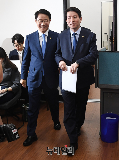 이인영 더불어민주당 원내대표와 조정식 정책위의장이 7일 오전 국회에서 열린 정책조정회의에 참석하기 위해 입장하고 있다.