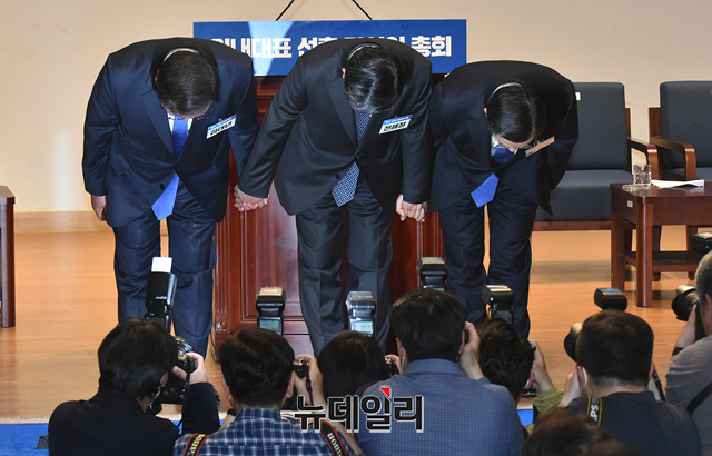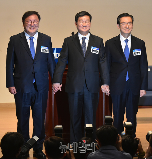 더불어민주당 원내대표 선거에 출마한 김태년, 전해철, 정성호 후보가 7일 국회 의원회관 대회의실에서 열린 제21대 국회 제1기 원내대표 선출을 위한 민주당 당선인 총회에서 기념사진을 촬영하고 있다.