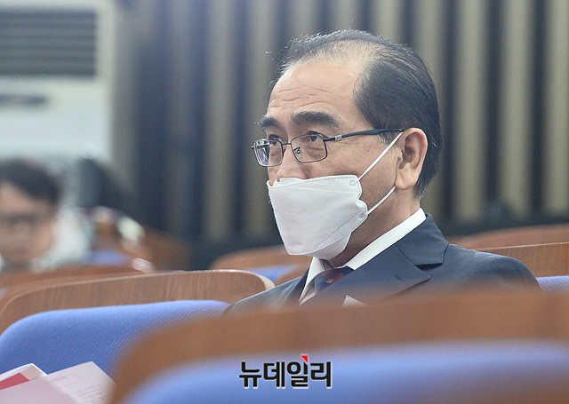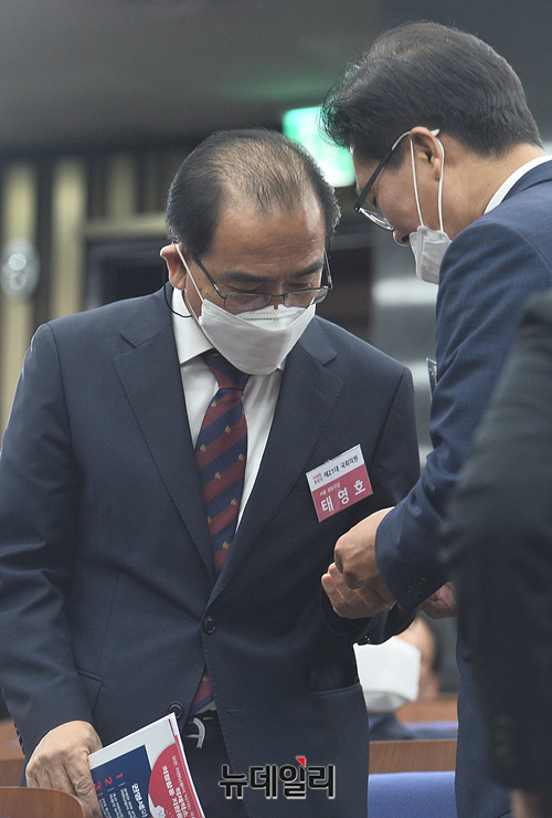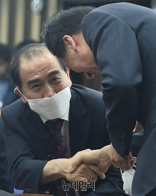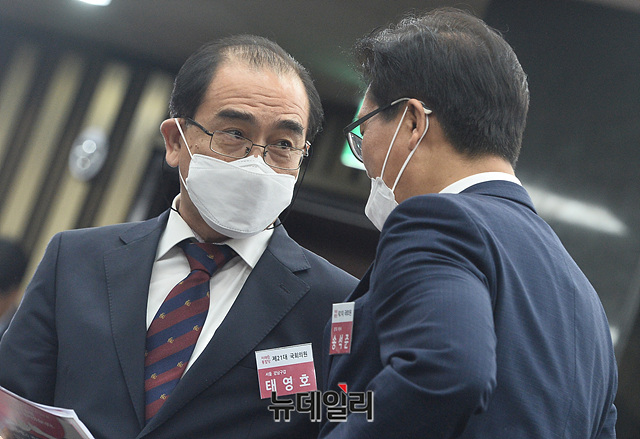 태구민(태영호) 미래통합당 당선자가 8일 오전 국회에서 열린 2020년 원내대표 및 정책위의장 선출을 위한 당선자총회에서 동료 당선자와 인사를 나누고 있다.