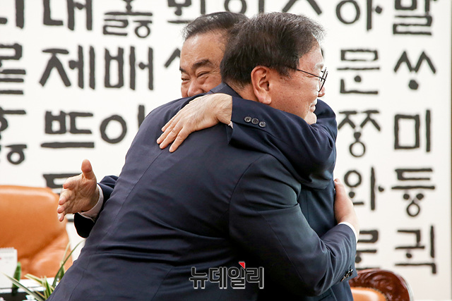 김태년 더불어민주당 신임 원내대표(왼쪽)가 8일 국회에서 문희상 국회의장을 예방해 기념촬영을 하고 있다.