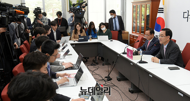 미래통합당 원내대표·정책위의장으로 선출된 주호영·이종배 의원이 8일 오후 국회에서 열린 기자간담회에서 당선 소감을 밝히고 있다.