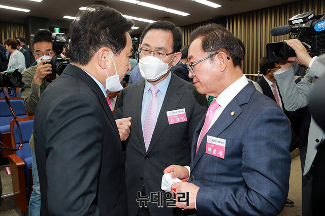 미래통합당 원내대표·정책위의장으로 선출된 주호영·이종배 의원이 8일 오후 국회에서 열린 2020년 원내대표 및 정책위의장 선출을 위한 당선자총회에서 심재철 원내대표와 대화를 나누고 있다.