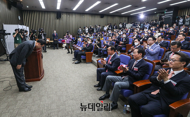 미래통합당 원내대표로 선출된 주호영 의원이 8일 오후 국회에서 열린 2020년 원내대표 및 정책위의장 선출을 위한 당선자총회에서 당선이 된 직후 당선인들에게 인사를 하고 있다.