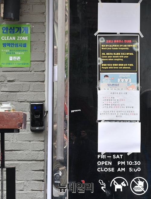 이태원 클럽 관련 '코로나19(중국 우한 폐렴)' 확진자가 15명 발생한 8일 오후 서울 용산구의 한 클럽 입구에 유흥시설 준수사항 안내문이 붙어있다.