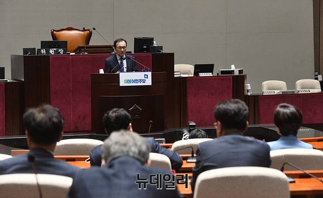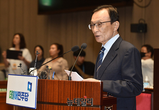 이해찬 더불어민주당 대표가 8일 오후 국회에서 열린 의원총회에 참석해 발언을 하고 있다.