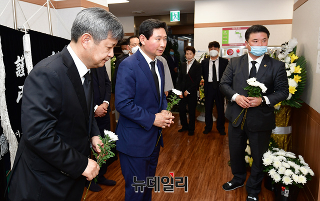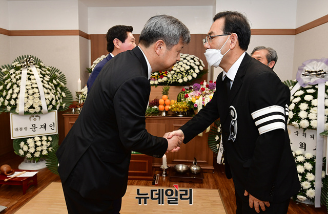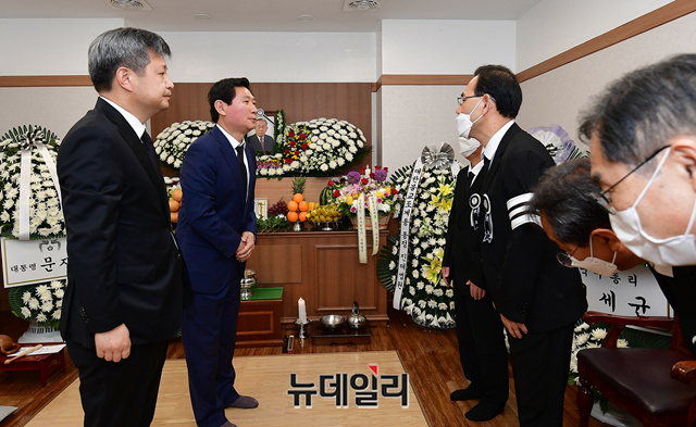 이상일 미래통합당 당선인과 김장겸 전 MBC 사장이 10일 오후 대구 중구 경북대학교 장례식장에 마련된 주호영 미래통합당 신임 원내대표 부친 주구원 씨의 빈소를 찾아 조문하고 있다. (대구=정상윤 기자)