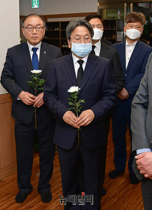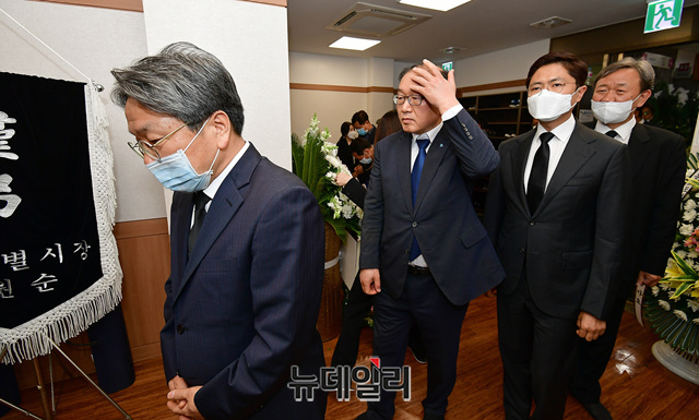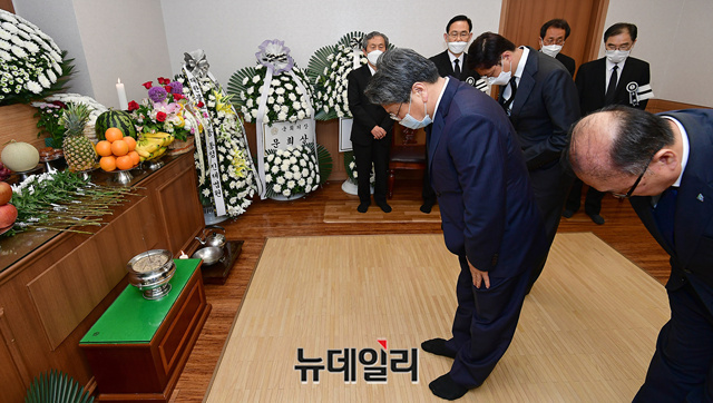 강기정 청와대 정무수석, 김광진 정무비서관, 김우철 더불어민주당 대구시당 사무처장이 10일 오후 대구 중구 경북대학교 장례식장에 마련된 주호영 미래통합당 신임 원내대표 부친 주구원 씨의 빈소를 찾아 조문하고 있다. (대구=정상윤 기자)