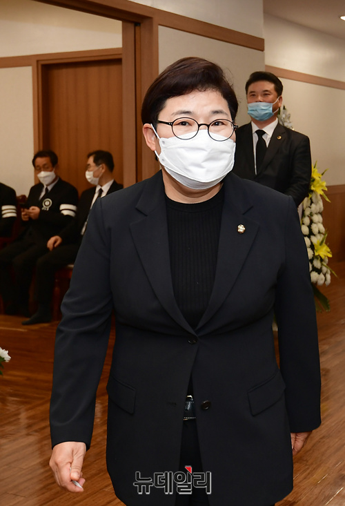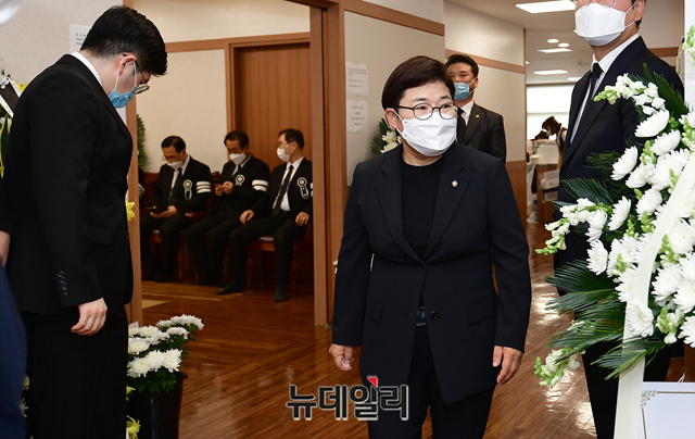 임이자 미래통합당 의원이 10일 오후 대구 중구 경북대학교 장례식장에 마련된 주호영 미래통합당 신임 원내대표 부친 주구원 씨의 빈소를 찾아 조문후 식장을 나서고 있다. (대구=정상윤 기자)