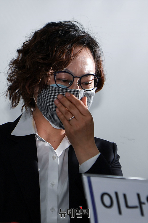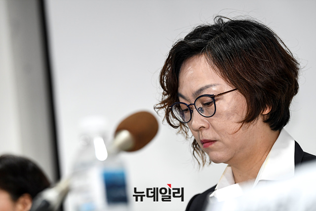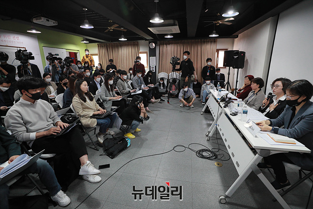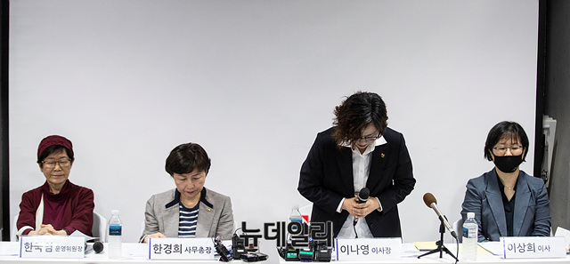 이나영 정의기억연대 이사장이 11일 오전 서울 마포구 인권재단사람에서 위안부 피해자 관련 기부금수입과 사업별지출내역 등을 밝히는 기자회견을 갖고 있다.