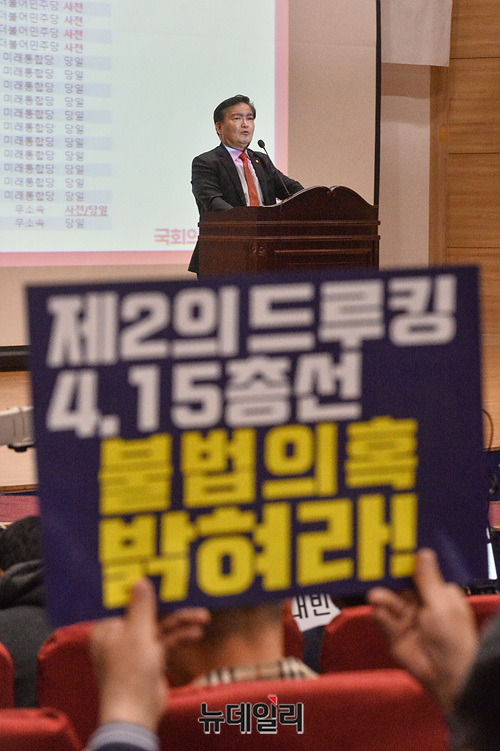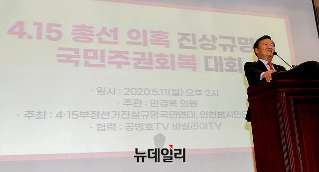 민경욱 미래통합당 의원이 11일 오후 국회 의원회관에서 열린 '4.15총선의혹진상규명과 국민주권회복 대회'에서 부정선거 의혹을 제기하고 있다. 민 의원은 "경기 분당갑 투표용지가 분당을에서 발견된 사례 등 4.15 부정선거 관련 의혹이 다수 발견됐다"고 밝혔다.