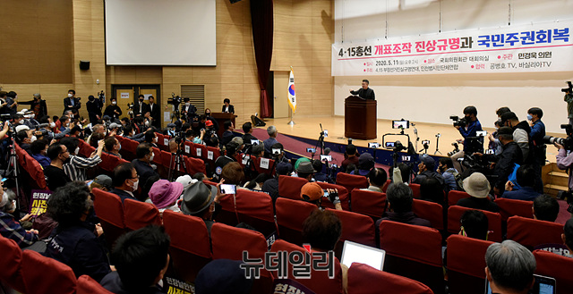 유튜브 바실리아TV 운영자 조슈아 씨와 공병호TV 운영자 공병호 씨가 11일 오후 국회 의원회관에서 열린 '4.15총선의혹진상규명과 국민주권회복 대회'에서 부정선거 의혹을 각각 제기하고 있다.