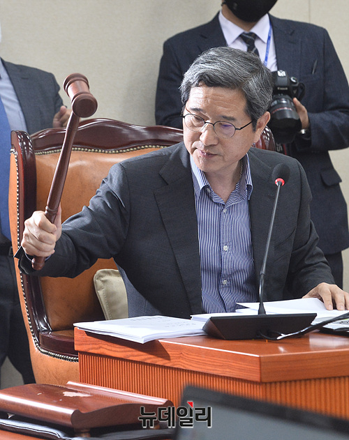 미래통합당 소속 김학용 환경노동위원회 위원장이 11일 오후 국회에서 열린 환노위 전체회의에서 의사진행을 하고 있다.