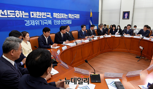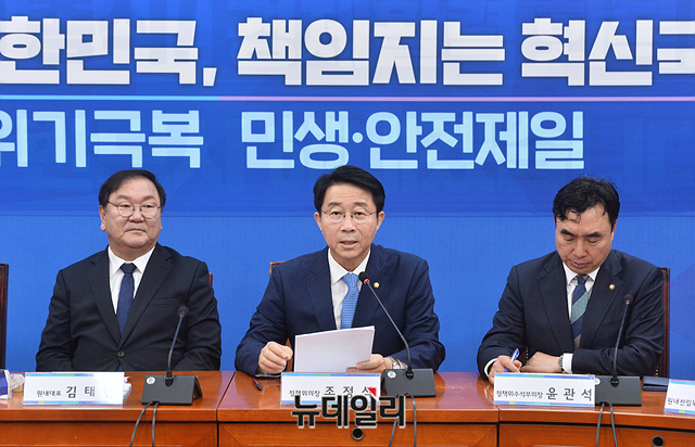 조정식 더불어민주당 정책위의장이 12일 오전 국회에서 열린 원내대책회의에 참석해 모두발언을 하고 있다.