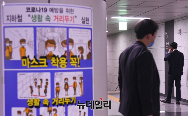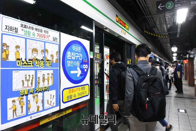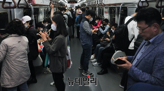 이태원 클럽과 관련해 '코로나19(중국 우한 폐렴)' 확진자가 100명을 돌파한 12일 오후 서울 중구 시청역을 이용하는 시민들이 대부분 마스크를 착용하고 이동하고 있다.13일부터 승객 분산을 위해 '혼잡도 사전예보제'를 실시한다. 지하철 혼잡도가 '혼잡' 단계에 이르면 마스크를 착용하지 않은 승객은 지하철 탑승이 제한된다. 기관사 등의 판단에 따라 무정차 통과도 가능하다.'혼잡도 사전예보제'는 '여유-보통-주의-혼잡'의 4단계로 나눠 전광판과 역사 안내방송으로 안내된다. 마스크 미소지 승객은 역사 안 자판기나 편의점 등에서 구입하면 된다.