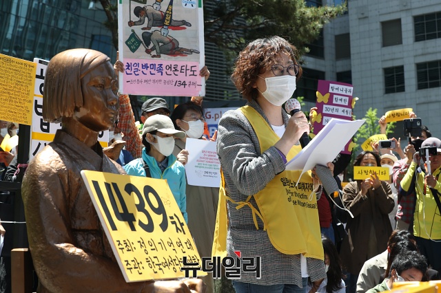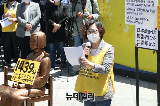 이나영 정의기억연대 이사장이 13일 오후 서울 종로구 전 일본대사관 앞 위안부소녀상에서 열린 1439차 정기 수요집회에서 후원금 회계 논란에 대해 발언하고 있다.