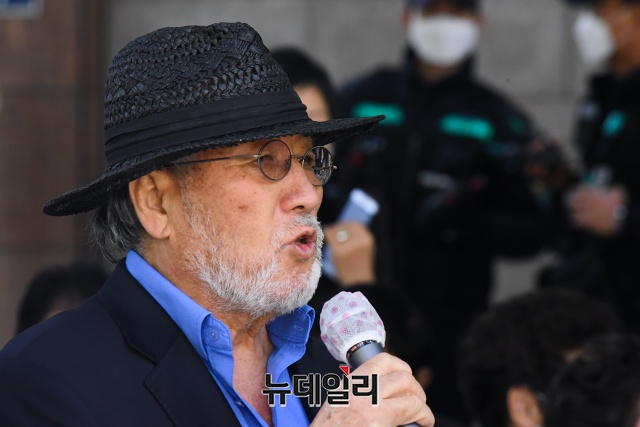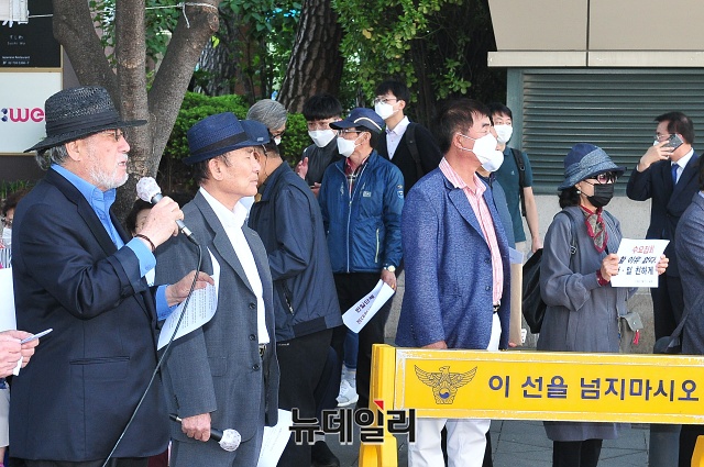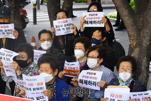 전국일제피해자단체장협회 회원들이 13일 오전 서울 종로구 전 일본대사관 앞 위안부소녀상 인근에서 위안부 수요집회 중단 촉구 및 윤미향 정의기억연대(정의연) 전 이사장 규탄 기자회견을 갖고 있다.