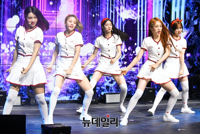 걸그룹 woo!ah!(우아!)가 13일 오후 서울 강남구 슈피겐홀에서 열린 데뷔 앨범 쇼케이스에서 무대를 선보이고 있다.