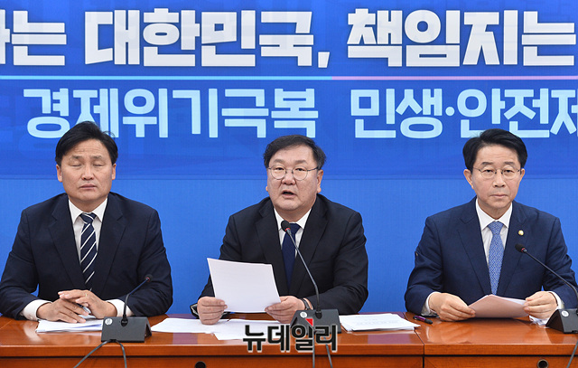 김태년 더불어민주당 원내대표가 14일 오전 국회에서 열린 정책조정회의에서 모두발언을 하고 있다.