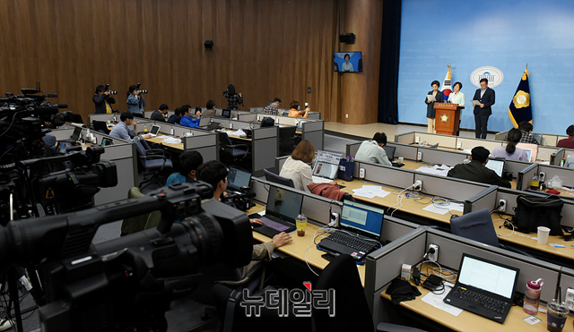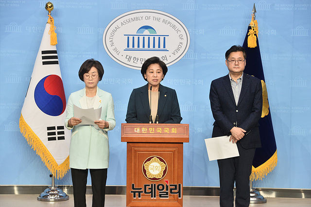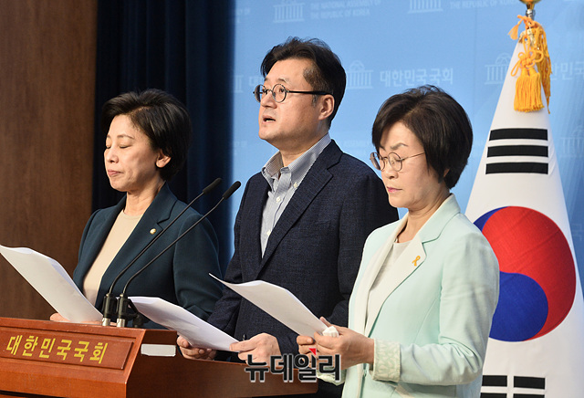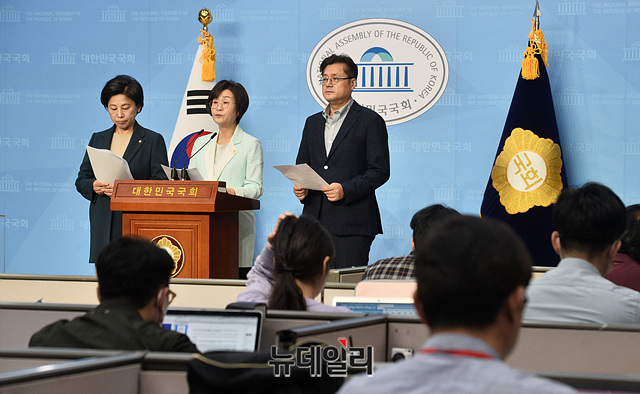 남인순·김상희·홍익표 더불어민주당 의원들이 14일 오전 국회 소통관 기자회견장에서 일본군성노예문제해결을위한정의기억연대(정의연)와 윤미향 당선인 관련 기자회견을 갖고 있다.