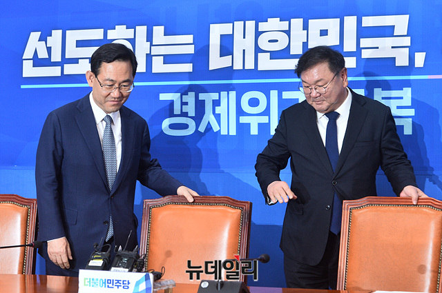주호영 미래통합당 원내대표(왼쪽), 김태년 더불어민주당 원내대표가 14일 오후 국회에서 원내대표 당선 이후 첫 회동을 갖고 있다.
