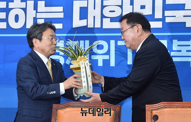 김태년 더불어민주당 신임 원내대표가 15일 오전 국회에서 강기정 청와대 정무수석과 접견하고 문재인 대통령의 축하 난을 전달받고 있다.