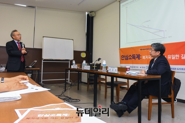박기성 성신여대 교수가 15일 오전 서울 중구 프란치스코 교육회관에서 열린 '안심소득제: 복지국가로 가는 유일한길' 토론회에서 안심소득제에 대해 설명하고 있다.