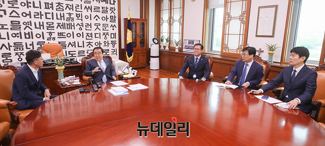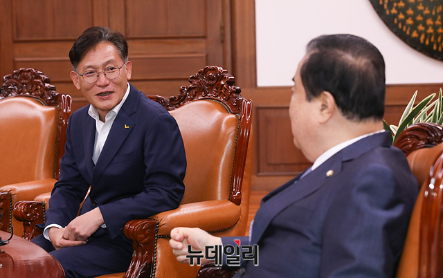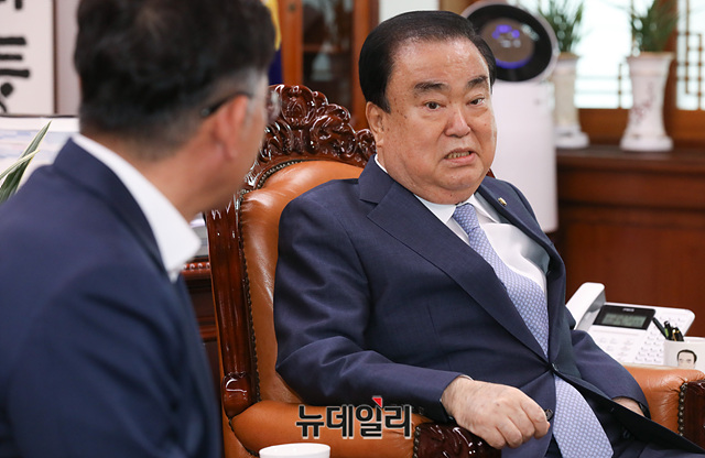 배진교 정의당 신임 원내대표가 15일 오후 국회에서 문희상 국회의장을 예방해 환담을 나누고 있다.