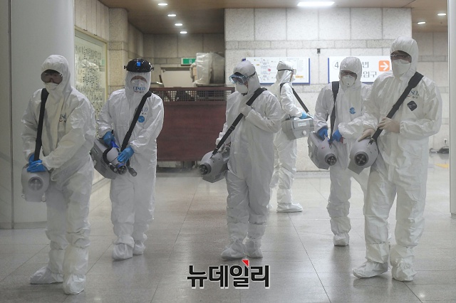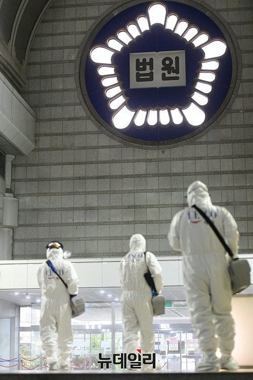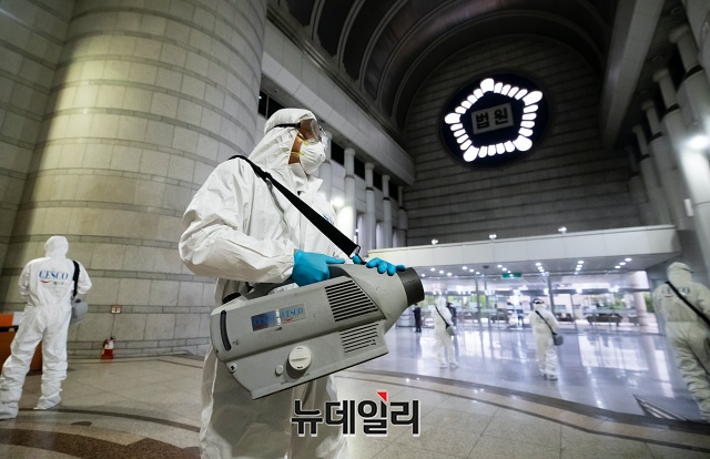 서울구치소 직원이 '코로나19(중국 우한 폐렴)' 확진 판정을 받은 15일 오후 방역요원이 서울 서초구 서울중앙지법 외관을 방역하고 있다. 서울중앙지법은 확산 예방조치로 청사 본관 법정을 전면 폐쇄하고 방역작업에 들어갔다.