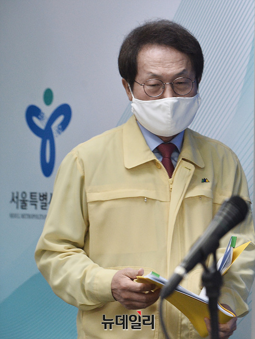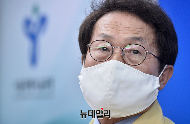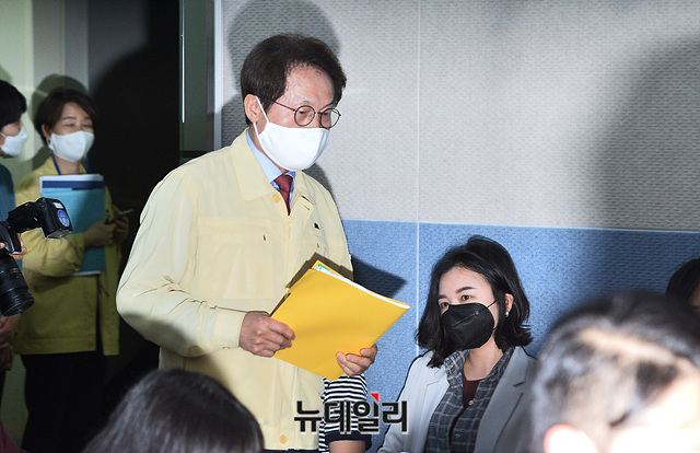 조희연 서울시교육감이 18일 오후 서울 종로구 서울시교육청에서 학생 등교 수업 운영 방안 관련 브리핑을 위해 입장하고 있다.