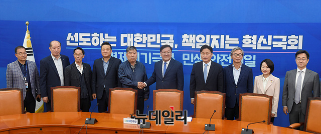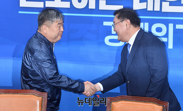 김태년 더불어민주당 원내대표가 19일 오전 국회에서 김동명 한국노총 위원장의 예방을 받고 악수를 하고 있다.