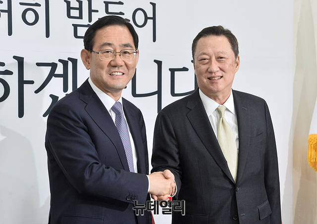 [포토] 국회서 악수나누는 '주호영-박용만'