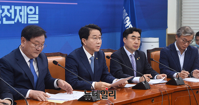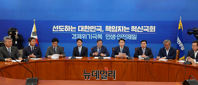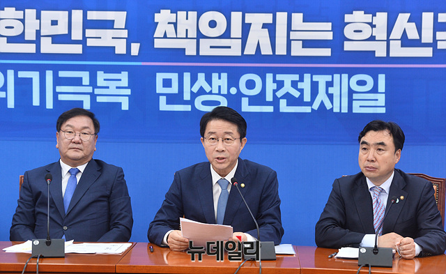 조정식 더불어민주당 정책위의장이 19일 오전 국회에서 열린 원내대책회의에서 모두발언을 하고 있다.