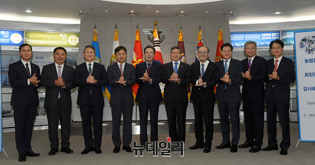 정경두 국방부 장관, 이성희 농협중앙회장 등 참석자들이 19일 오후 서울 용산구 국방부에서 열린 '6.25 전사자 유가족 유전자 시료확보 협력강화를 위한 농협중앙회 회장단 초청 감사패 증정식'에서 '덕분에 챌린지' 포즈를 취하며 기념촬영을 하고 있다.