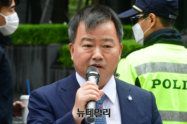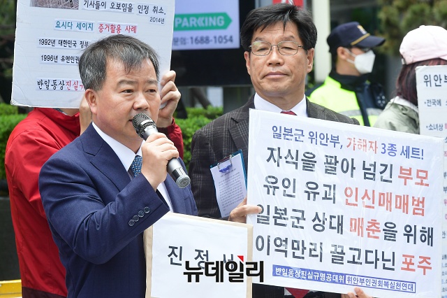 김기수 자유와통일을향한변호사연대(이하 자변) 대표가 19일 오후 서울 종로구 위안부소녀상 인근에서 열린 위안부 진실규명 기자회견에서 진정서를 들고 발언하고 있다.공대위는 "수요집회가 위안부 문제의 해결이 아니라 성노예 문제의 해결로 변질됐다"며 "군위안부의 삶을 살았던 어르신들이 성노예로 비하됐고, 청소년들에게는 끔찍한 전쟁범죄, 성노예의 개념이 주입됐다"고 했다.이어 "정대협과 정의기억연대는 수요집회에 참여한 청소년들에게 '강제연행' '성폭행' '전쟁범죄' '성노예' 등을 교육 시켜 정신건강 및 정신발달에 해를 끼쳤다"며 국가인권위원회의 인권침해행위 조사를 촉구했다.공대위는 기자회견 후 이 내용을 담은 진정서를 국가인권위원회에 접수할 예정이다.