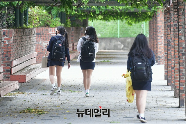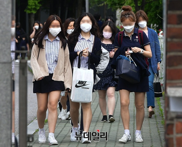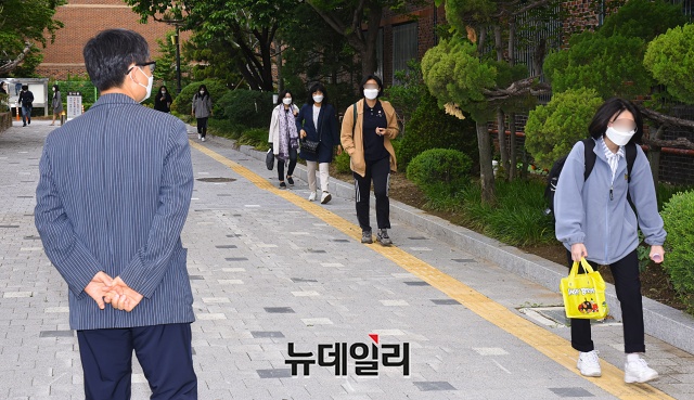 고등학교 3학년 등교수업이 실시된 20일 오전 서울 송파구 창덕여고에 학생들이 등교하고 있다.