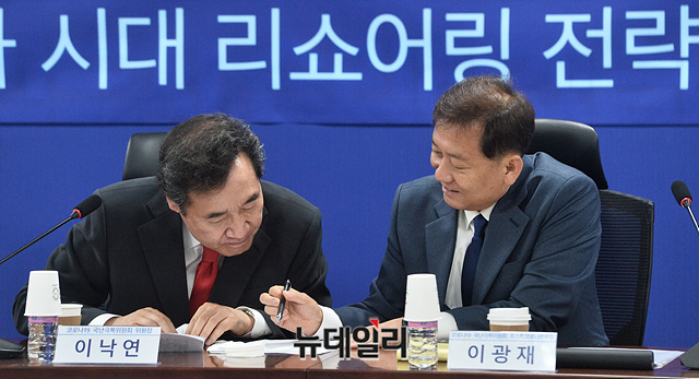 이낙연 더불어민주당 코로나19국난극복위원장과 이광재 포스트코로나본부장이 20일 오전 국회 의원회관에서 열린 '코로나19 국난 극복 위원회 간담회'에 참석해 대화를 나누고 있다.