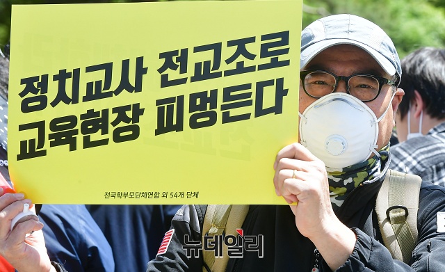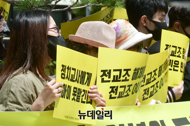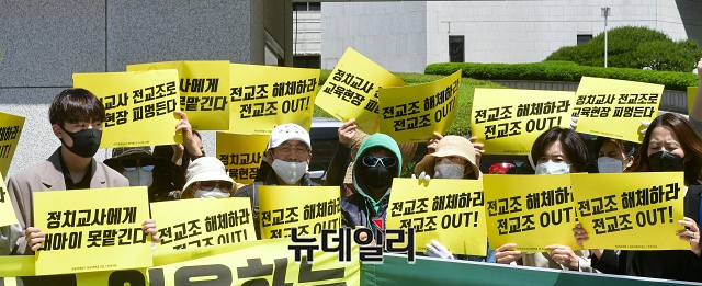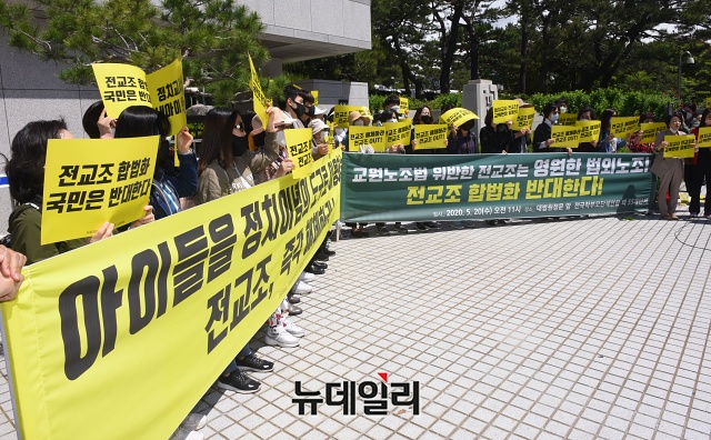 전국학부모단체연합을 비롯한 55개 단체가 20일 오전 서울 서초구 대법원 앞에서 전교조 합법화 반대 기자회견을 갖고 있다.이들은 "해직교사가 전교조 회원이 되길 원한다면 전교조는 영원히 불법노조, 법외노조가 될 것이다"며 "법원의 전교조 법외노조 판결을 존중하고, 그 판결이 유지되길 촉구한다"고 밝혔다.이날 대법원에선 '전교조 법외노조 통보처분 취소 사건에 대한 전원합의체 공개변론'이 예정돼있다.같은 시간 전교조는 대법원 앞에서 '전교조 법외노조 취소 기자회견'을 열었다.