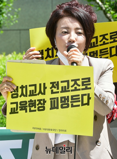 김수진 전국학부모단체연합 대표가 20일 오전 서울 서초구 대법원 앞에서 전교조 합법화 반대 기자회견에서 발언하고 있다.