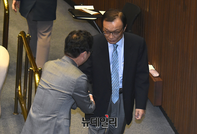 이해찬 더불어민주당 대표가 20일 오후 국회 본회의장에서 열린 제20대 국회 마지막 본회의에서 같은당 박범계 의원과 악수를 나누고 있다.