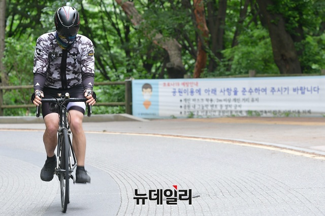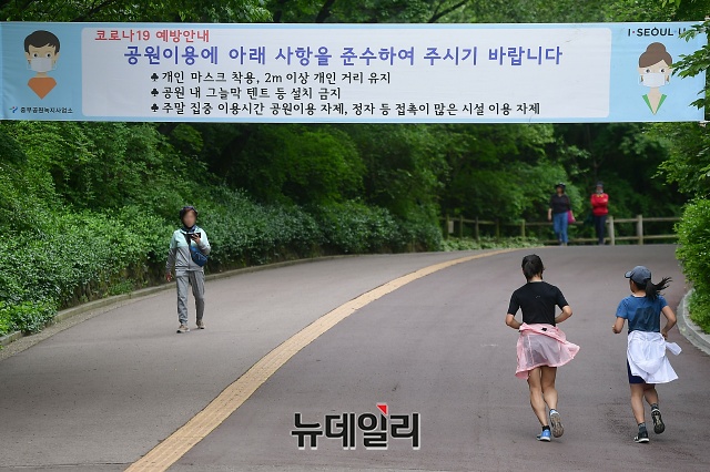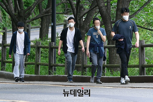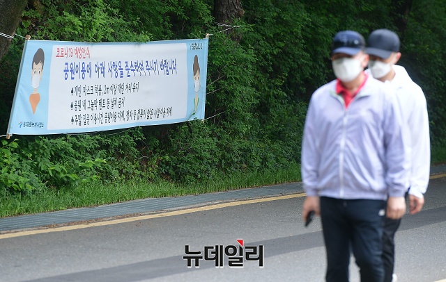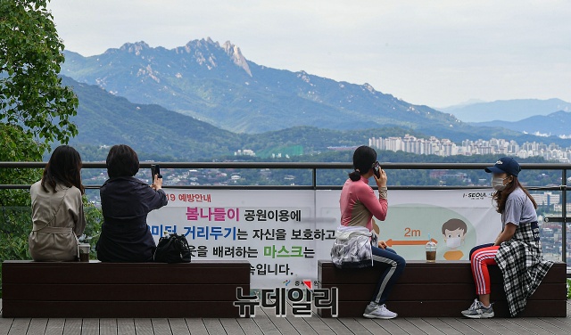 여름 기운이 들기 시작한다는 절기 '소만(小滿)'인 20일 오후 서울 용산구 남산 둘레길에서 시민들이 마스크를 착용하고 이동하고 있다. 국립환경과학원에 따르면 20일(오늘) 전국적으로 미세먼지와 초미세먼지가 '좋음'으로 예상되고, 서울의 시정거리를 20km 이상으로 예측했다.
