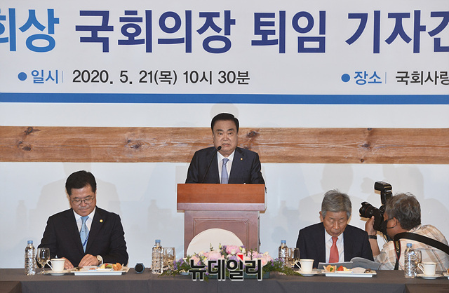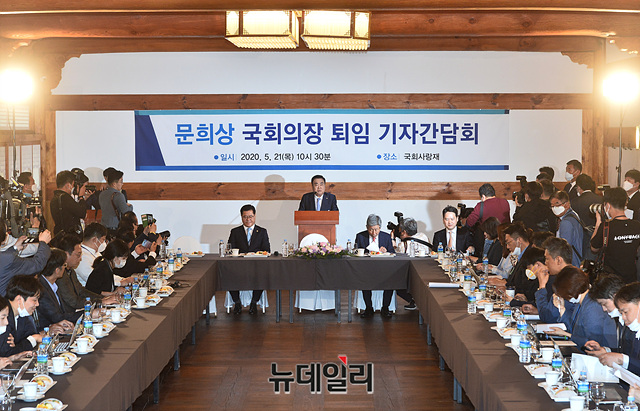 문희상 국회의장이 21일 오전 국회 사랑재에서 열린 퇴임 기자간담회에서 모두발언을 하고 있다.
