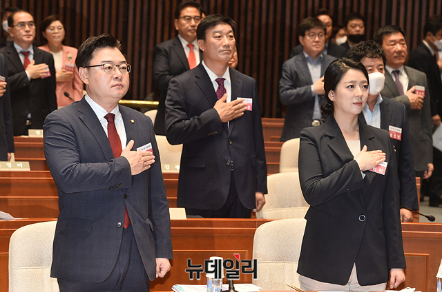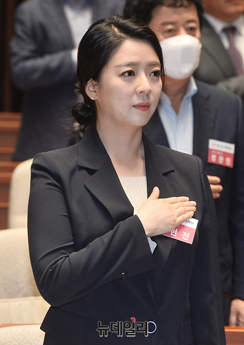 배현진 미래통합당 당선인이 21일 오전 국회에서 열린 '미래통합당 당선자 워크숍'에서 국민의례를 하고 있다.