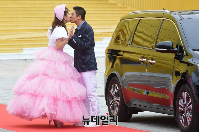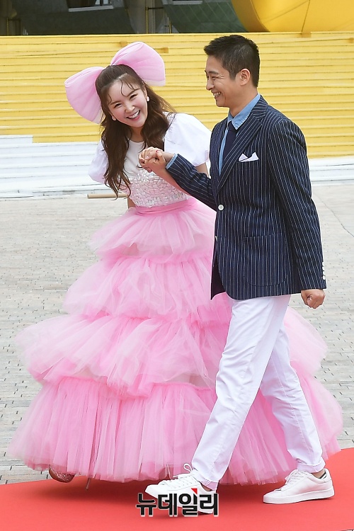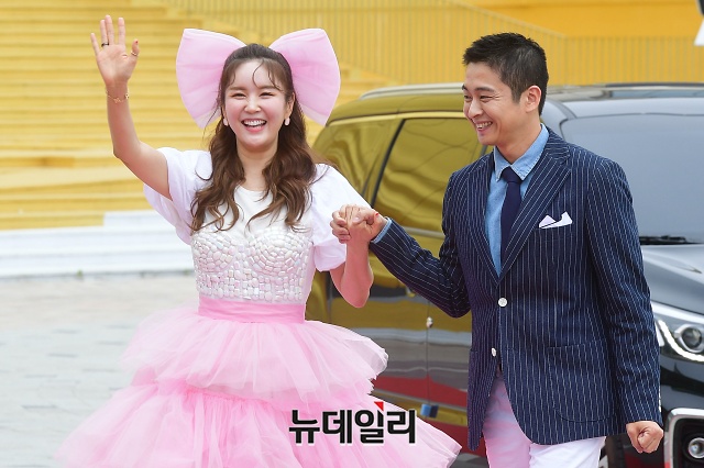 방송인 장영란(왼쪽), 한창 부부가 21일 오전 인천 중구 파라다이스시티 스튜디오 파라다이스에서 열린 TV조선 예능 '아내의 맛 100회 특집 포토콜 행사'에 앞서 레드카펫을 걸어오고 있다.