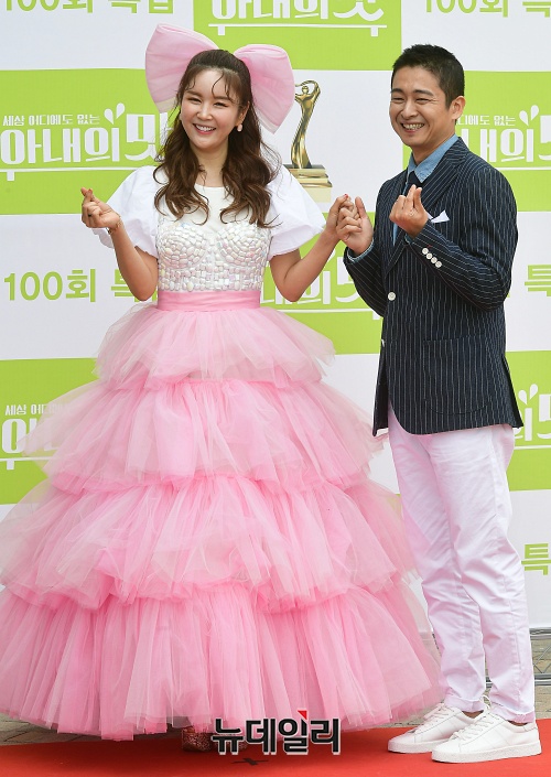 방송인 장영란(왼쪽), 한창 부부가 21일 오전 인천 중구 파라다이스시티 스튜디오 파라다이스에서 열린 TV조선 예능 '아내의 맛 100회 특집 포토콜 행사'에서 포토타임을 갖고 있다.