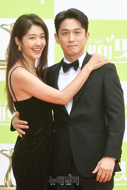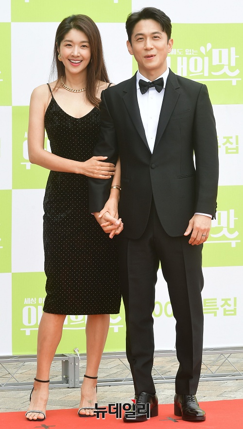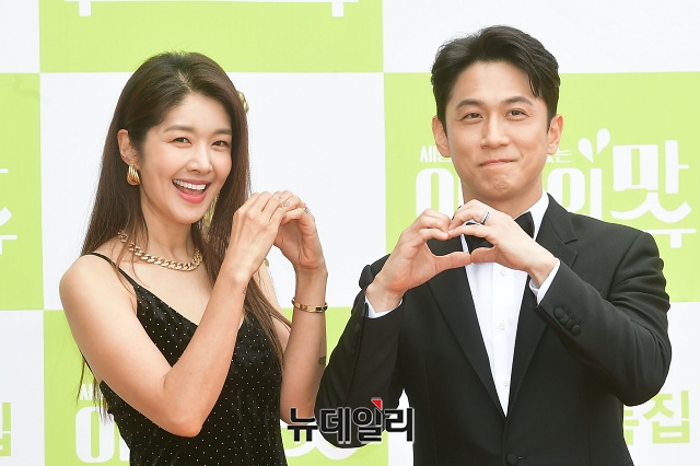 배우 김빈우(왼쪽), 전용진 부부가 21일 오전 인천 중구 파라다이스시티 스튜디오 파라다이스에서 열린 TV조선 예능 '아내의 맛 100회 특집 포토콜 행사'에서 포토타임을 갖고 있다.
